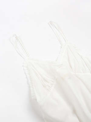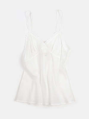 Bias-cut and seamed camisole in white cotton voile with tonal ruffle trim and double interlocking spaghetti straps. Our Gilda camisole is cut for a relaxed, flattering fit. Layer with jackets, knits, and bloused and let the lace-trimmed v neckline subtly peek out from underneath. Our cotton voile is a weightless fabric that travels with you easily. Twist in ball, pack into your luggage, and gently shake out to wear straight away. Erica Tanov Details Made in USA. 100% Cotton. Hand wash cold and line dry. Model is 5'8" and wears a size 1. Sizing *measurements of Chest / Waist are circumference measurements Erica Tanov Size US Size Chest Circumference Waist Circumference Length 0 0-2 34.75" 30" 22.5" 1 2-4 35.5" 32" 23.75" 2 6-8 36" 35" 24.75" 3 10 40.5" 35.5" 25" 4 12 41" 38" 25.5"