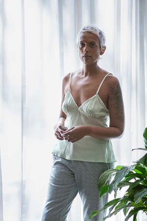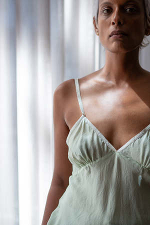 Bias-cut and seamed camisole in jade petal silk with metallic silver Japanese ribbon trim. The Gilda camisole is cut for a relaxed, flattering fit. Layer with blazers, knits, and dresses and let the metallic ribbon trimmed neckline subtly peek out from underneath. Our signature Petal Silk is hand washed and line dried in our studio, giving our slips and camisoles that soft, relaxed feel of an heirloom piece. Our Petal Silk is a weightless fabric that travels with you easily. Twist in ball, pack into your luggage, and gently shake out to wear straight away. Erica Tanov Shown with the Hudson Pant in Quartz Cotton Jacquard. Details Made in USA. 100% silk. Hand wash or dry clean. Sizing Model is 5'8" and wears a size 1.