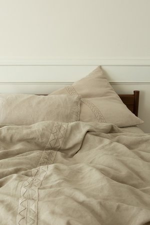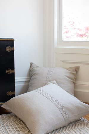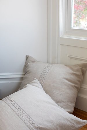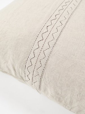 Our washed 100% linen shams bring together the best in soft natural fabrics and beautiful craftmanship. All of our home linens are made by our artisan partners in Jaipur, where traditional textile techniques have been passed down through families for centuries. The most beautiful act of self care is a luxurious nights sleep which starts with treating yourself to Erica Tanov bedding. Ericas signature designs bring a modern sensibility to these time honored crafts of hand-applique and embroidery. The result? A bed that not only looks and feels luxurious - but provides a glorious nights sleep you (and your guests) will cherish. Both durable and timeless, our washed 100% linen sheets have built in temperature regulating properties that are perfect year-round. About Mountain Our Mountain appliqu motif is meticulously made by hand in Jaipur, following a traditional Barmer technique. Hand cut linen is shaped, folded and stitched in our Mountain motif, then embroidered on our undyed natural linen creating a subtle tonal geometric pattern. The super soft, washed, and undyed Mountain linens are perfect for a home rich in design and natural, understated luxury. Details Measures 26" x 26". Insert not included. Made in India. 100% linen. Shell button closures. Machine wash cool and tumble dry low. We recommend line drying to extend the life of the embroidery and appliqu. Washed linen has temperature-regulating properties and is perfect for year-round use.