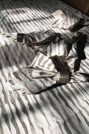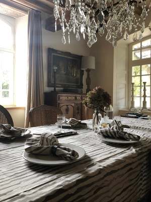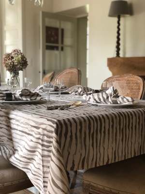 Cotton poplin tablecloth in the Erica Tanov original 'Alder' print. Measures 67" x 98" Erica Tanov Details Made in India. 100% Cotton. Machine wash and dry.