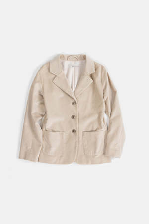 Fitted blazer in a porcelain cotton velvet with patch pockets and silver buttons. Lined in fluid alabaster silk charmeuse. Perfect for everyday elevated dressing and wearing with its matching Hudson Pant for refined suiting. Details Made in USA. 100% Cotton. 100% Silk lining. Dry clean only. Choose your dry cleaner responsibly. Sizing Erica Tanov Size US Size Sleeve Chest Length 0 0-2 22.75 16.5" 26" 1 2-4 23 18" 27" 2 6-8 23.5 19" 28" 3 10 24.25 19.5" 29" 4 12 24.75" 20.5" 30"