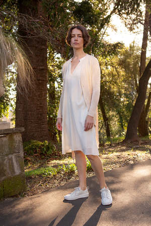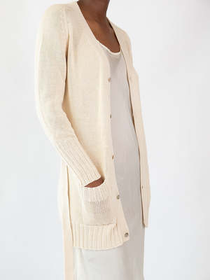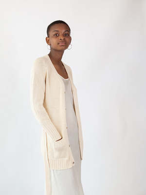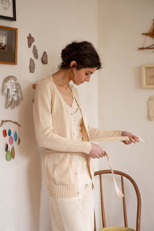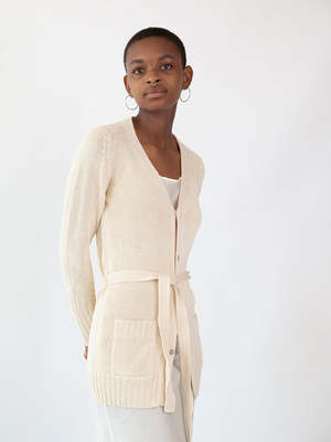 Belted cardigan in natural pima cotton with shell buttons. Features generous pockets, saddle raglan sleeve, and ribbed details at pocket, sleeve cuff, and hem. Knit on manual machines in Bolivia and finished by hand. Our timeless, perfect layering knit. A minimal, elegant silhouette to pair with jeans and a t-shirt or over a silk slip dress. Shown with the Greta Silk Slip Dress in ivory. Details Ethically and sustainably made in Bolivia. 100% Pima cotton. Hand wash cool and dry flat. Model is 5'4 and wears a size 1. Sizing Erica Tanov Size US Size Chest Sleeve Length 0 2-4 15.5" 23" 27.75" 1 6-8 16.5" 23.5" 28.75" 2 10 17" 25.5" 29" 3 12 18.5" 26.25" 30.5"
