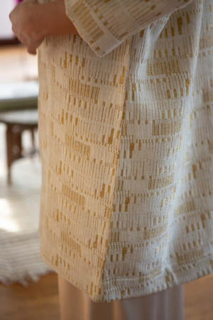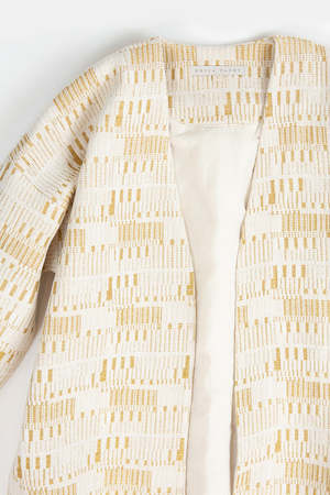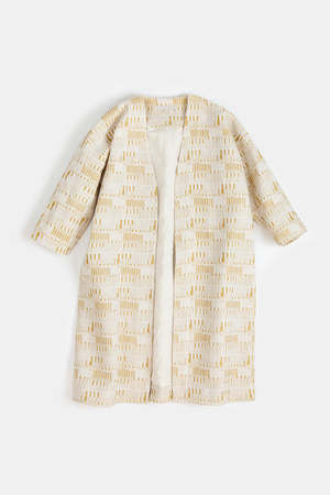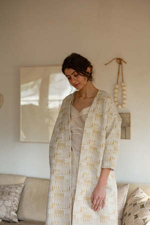 Mid-length open Uma Coat in the textural, gold-flecked Amaral tapestry. Elongated silhouette with 3/4 length sleeves and pockets at the sides. Details: - Made in India - 100% cotton - 100% cotton lining - Dry clean only.