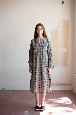 Soft, lightweight cotton poplin midi-length tunic dress with notched neck and slits at sleeves and hem. An original Erica Tanov print. Made in India. 100% Cotton. Hand wash cold separately and line dry. Erica Tanov
