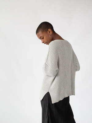 Relaxed pima cotton pullover in light grey with long sleeves, scoop neck, and small side slits for a generous fit a perfect unisex layering piece. Thoughtfully knit in Bolivia on machines and finished by hand. Erica Tanov Sizing Erica Tanov Size US Size Chest Sleeve Length 1 6-8 21.5" 13.5" 23" 2 10 22" 14" 23.5" 3 12 23" 15" 26" Details Ethically handmade in Bolivia. 100% cotton. Hand wash cold and dry flat. Model is 5'4" and wears a size 2.