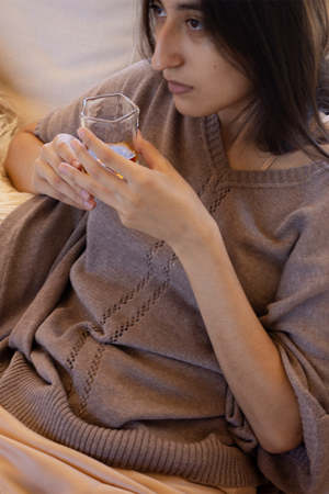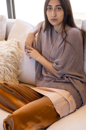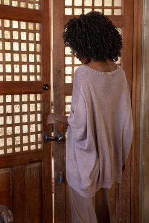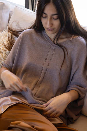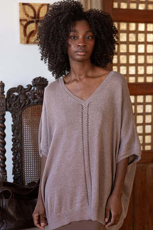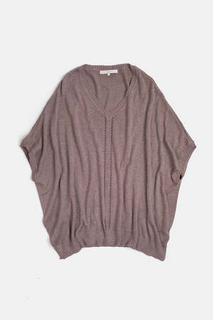 Easy, relaxed oversized dolman sleeve sweater in a haze-colored pima cotton with pointelle detail at front. Ribbed detailing at neckline, hem, and sleeves. Details: - One size. - Made in Bolivia. - 100% organic cotton. - Wash cold and dry flat.