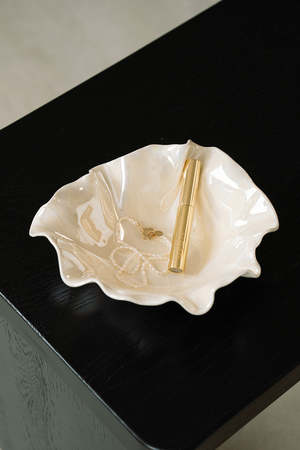 This Oyster Bowl captures the quiet elegance of the sea in sculpted form. Each piece is hand-built and shaped by touch, creating soft ripples and a waved edge that echo the movement of water and shell. No two bowls are ever alike, giving each one a distinct character and organic beauty. This piece is intended for decorative use. It is perfect for holding jewelry, incense, or simply standing on its own as a sculptural accent. The refined texture and fluid silhouette make it a timeless addition to any interior. Care: Avoid placing abrasive items on Pearl and Black Mirror finishes. Avoid resting oils or water for too long on Black Mirror. Wipe clean with rubbings alcohol. Hand wash only. Do not use abrasive materials to clean Pearl or Black Mirror surfaces. Measurements (approximate): Width: 6.5" Length: 8.5" Height: 2.0"