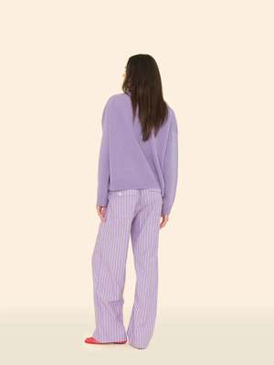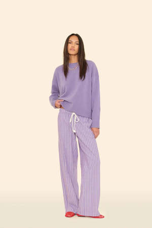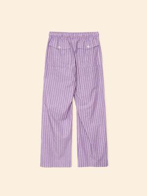 Brinna is a wide-leg pull-on pant made in a lightweight cotton stripe. It features an elasticized waist, contrast braided drawcord, side seam pockets, and back pockets with button closures. Composition: 100% cotton Color: Violet Rouge Stripe Fit: True to size Designer ID: X7AMS045