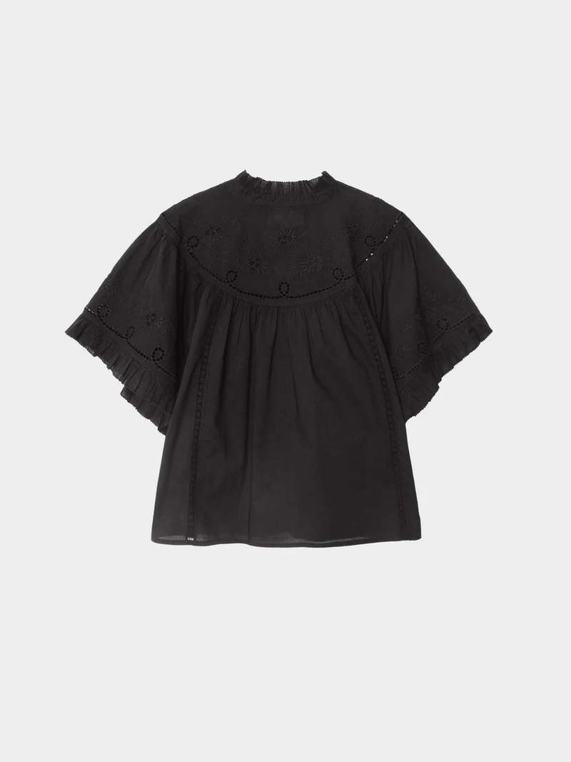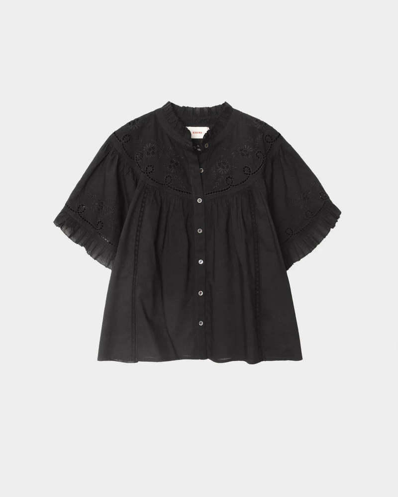 Mae is crafted from superfine Calista Cotton Voile with a soft, airy hand, making it an effortlessly feminine wardrobe staple. This button-front blouse features a ruffled collar and sleeve cuffs, enhanced with intricate embroidery and lace trim throughout for a romantic, refined finish. Fabric: Calista Cotton Voile | 100% Cotton Fit: True to size Designed in Los Angeles. Care Guide Machine wash cold, gentle cycle, tumble dry low.