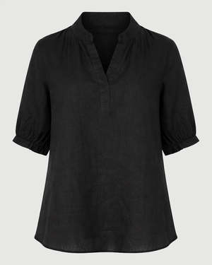 The Camila Top in Black Linen by Xirena is a short sleeve, relaxed top crafted in a lightweight linen fabrication featuring a gathered cuff and V-neckline. - Material: 100% Linen - Fit: Relaxed fit - Style #: X5MRL048