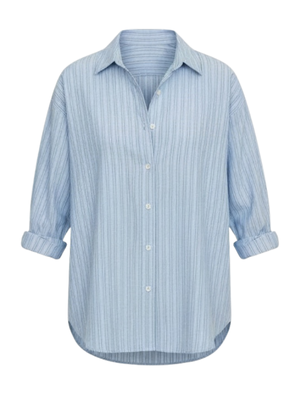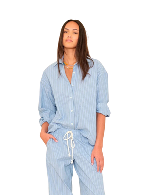 Xirena's Hayven Shirt is an oversized, menswear-inspired button-down shirt made from a lightweight cotton stripe. Pair it with the Brianna Pant for a matching set. Product Details Designer ID: X5AMS045 Color: Chambray Teal Stripe Composition: 100% Cotton Made in USA.