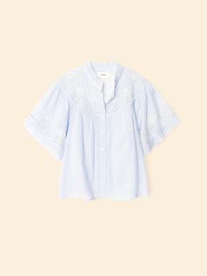Made of superfine cotton voile with a soft hand, this ultra-femme button-front shirt features a ruffled collar and sleeve cuffs, finished with intricate embroidery and lace trim throughout. - Fabric: Calista Cotton | 100% Cotton - Care: Machine wash cold, gentle cycle, tumble dry low - Fit: True to size - Model is 5'10" and wears size Small - Designed in Los Angeles