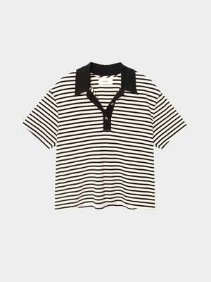 The Kellie Top is new this season in an ultra-soft striped cotton jersey. Kellie is a short sleeve polo tee with a faux horn button-front and contrast neck. Fabric: Monarch Stripe Jersey | 100% Cotton Care: Machine wash cold, gentle cycle, tumble dry low. Fit: True to size. Model is 5'10" and wears size Small. Made in Los Angeles.