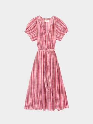 The Harlow dress is new this season in a cotton confetti check print. This charming midi dress features a V-neck, puff sleeves with subtle ruffle cuffs, and a self-tie belt for added shape and definition. - Fabric: Confetti Check | 100% Cotton - Self-fabric tie belt - Care: Machine wash cold, gentle cycle, tumble dry low - Fit: True to size - Model is 5'10" and wears size Small - Made in Los Angeles, USA Size guide (inches): - XS: Bust 3132, Waist 2325, Hip 3435 - S: Bust 3335, Waist 2527, Hip 3638 - M: Bust 3638, Waist 2830, Hip 3941 - L: Bust 3940, Waist 3132, Hip 4243 - XL: Bust 4142, Waist 3334, Hip 4445
