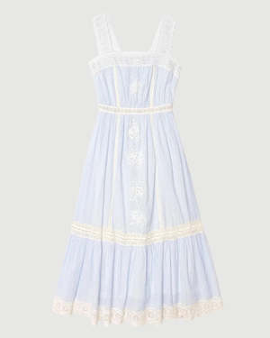 The Anita Dress in Blue White Stripe by Xirena is a delicate, feminine midi dress featuring eyelet straps, intricate embroidery, lace trim, and a ruffled hem. The elasticized back provides added comfort to this superfine cotton voile dress. - Material: 100% Cotton - Fit: True to size - Style #: X4CSC045 Model is wearing a size small.