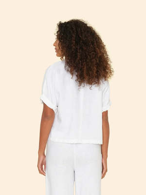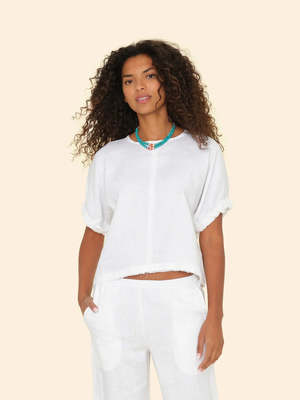 Vacation Mode. Savoye is new this season in lightweight linen. This easy pullover top features stitched rolled sleeves, raw edge hem, and a keyhole button-back. We recommend pairing it back to the Lorenzo Pant in Black Quartz for the full linen look.