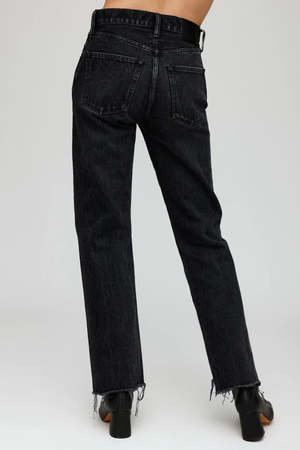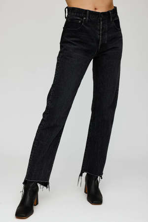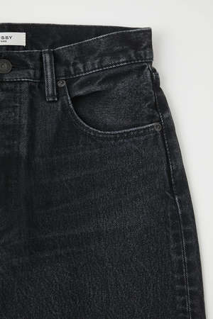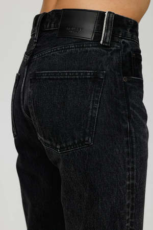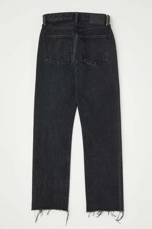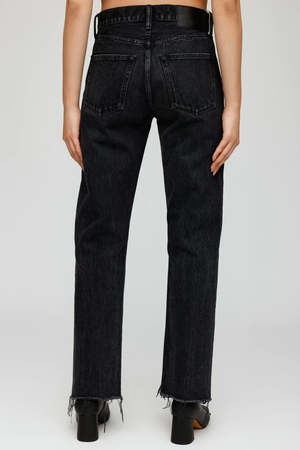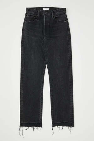 description: - Black wash straight leg jeans - Button closure - Step up frayed hem fabric: Body: 100% Cotton Label: Cowhide Leather measurements: Designed for a loose fit. Model is 5'6" / 170 cm and wearing size 26. Model Measurements: Bust 80 cm, Waist 62 cm, Hips 87 cm rise: 10.5", inseam: 29"