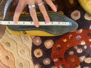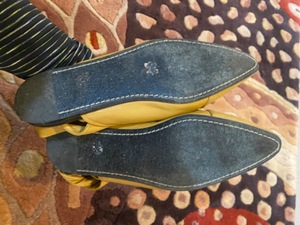 Worn a couple times. Minor wear on the toe - havent tried to buff the mark out. Not noticeable when wearing So soft and surprisingly comfy!! Mustard yellow