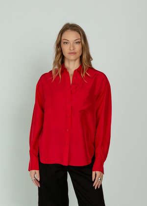 Closed's Oversize Shirt is crafted of silk with a subtle sheen and features a patch chest pocket, curved hem, and back yoke. Details - Button front - Chest pocket - Long sleeves with rib knit trim - Curved hem - Back yoke - Dry clean - Made in China Color: Rose Red. 100% Silk.