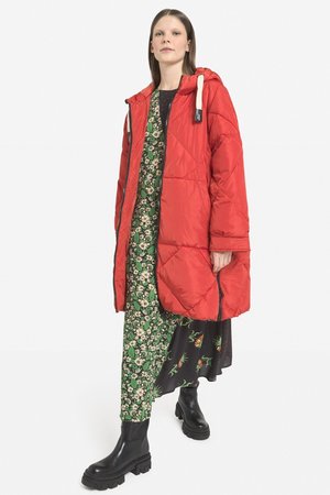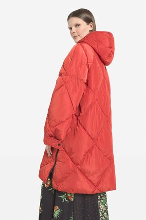 Form and function! We love this midi length down coat from Ottod'ame, especially in this tomato red color. Quilted down jacket with hood, contrasting zippers, and front patch pockets. DETAILS + FIT - 100% polyester - Zip front, zip side vents, drawstring hood - Made in Italy