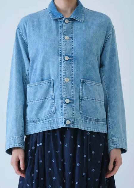 This Pas de Calais jacket is made from 8oz natural slub yarn denim that has been designed with a low thread count and a twill weave to create a voluminous and soft feel. This denim jacket features a boxy silhouette, large front patch pockets, slightly curved sleeves that create a three-dimensional form that is extremely comfortable to wear, a back button tab to easily adjust the fit, and a small collar with a button front. This garment has undergone a special process called Spin Wash, where the color is bleached to create a distressed, uneven look. Fits true to size. Size 36 measures approximately - Length 57cm - Shoulder width 50cm - Sleeve length 55cm 100% cotton. Made in Japan.