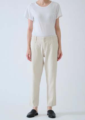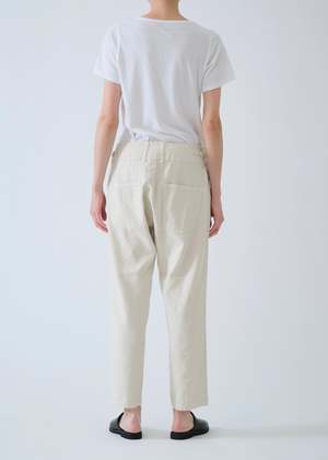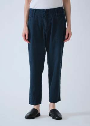 These Pas de Calais pants are crafted from a soft linen and cotton blend with a twill weave throughout. They feature a mid-rise with a double button and zip front closure, a wide waistband with adjustable tabs at the sides for the perfect fit, two front slant pockets, two back patch pockets, a slightly tapered leg, and a subtle crinkle effect throughout. Fits true to size if you want a more tailored look, we recommend sizing down. 50% cotton, 50% linen. Hand wash cold or professional dry clean. Made in Japan.