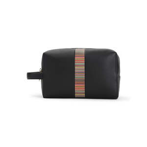 Men > Bags > Shoulder Bags Paul Smith black cow leather wash bag with top zip fastening, front multicolor stripe strap, side tonal leather strap, side gold-tone engraved logo2, and one main compartment.