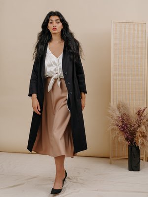 Long duster jacket with over sized welt pockets, three button front closure, back vent and belt. 100% cotton twill. Made in New York City. Our model is 5'8 and is wearing a size small. She is wearing the Norma jacket with the Diane blouse in silk charmeuse and the Shadow skirt in dune wool twill.