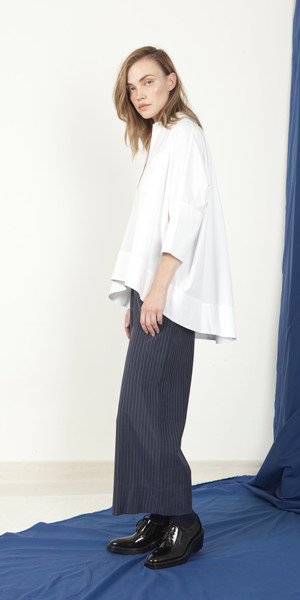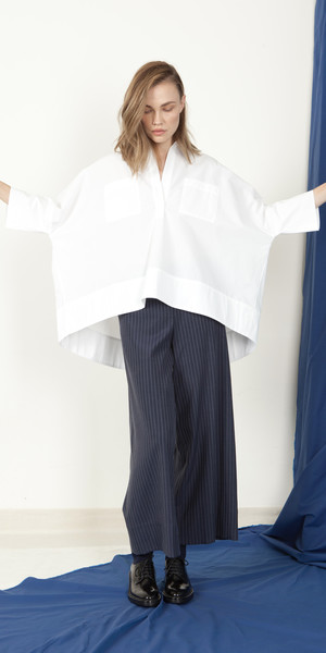 Squared, high-low Italian cotton shirt provides comfortable room for movement and flow. Easy to twirl and sashay in, yet feel put-together and urban whether you are strolling down the city streets or the rural streets. High-low length with wide hem detail is eye-catching. The fine fabric naturally flows and streams in the wind giving feelings of exhilaration in taking flight. 100% Cotton with artisanal finish from Italy. Ink available upon request. Made in New York, U.S.A. Special orders available. Please contact us for details. Also available in: Chartreuse