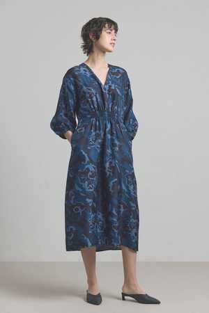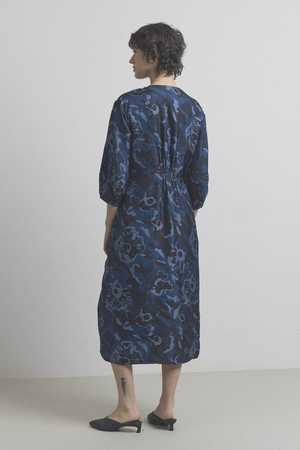 The Saltaire Dress exudes elegance and sophistication. Made from a custom digital silk print, it features a flattering deep v-neckline and 3/4 length sleeves with an elastic cuff that can be pushed up for a billowing effect. The A-line silhouette is accentuated by smocked waist details for a flattering fit. Elevate any occasion with this timeless dress.