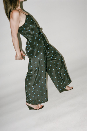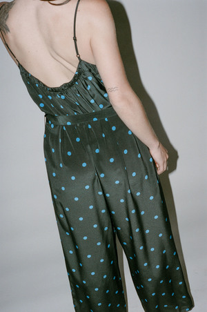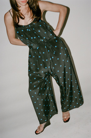 No.6 Eve Jumpsuit in Black/Royal Dot - Effortless throw on and go polka dot jumpsuit. Wide leg with drop crotch. Gathered detail at scoop neck. Adjustable spaghetti straps. Side pockets. Relaxed, slightly oversized fit. Looks great styled over a turtleneck in cooler months. - Fabric: 35% Silk, 65% Rayon. - Made in the U.S. - Size S: Bust 46"; Waist 50"; Hip 54"; Inseam 24"; Length 52.5". - Size M: Bust 48"; Waist 52"; Hip 56"; Inseam 25"; Length 53". - Size L: Bust 50"; Waist 54"; Hip 58"; Inseam 26"; Length 53.5". - Questions about this item? Please e-mail us at info@shopnonna.com