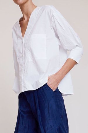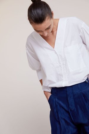 A definite wardrobe staple, the Turin blouse from No. 6. Crafted in a cotton poplin, this slightly boxy draped blouse can be paired with your favorite denim or tailored trousers. A bit about the brand: Owner and designer Karin Beresons creative sensibilities come from her days as a stylist, before she launched No.6 in 2005. Since then, the brand has gained a cult following for Beresons retro inspired prints, wearable silhouettes and clog boots.