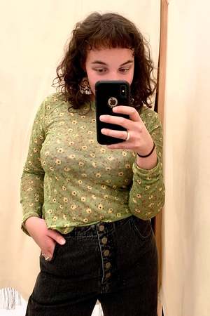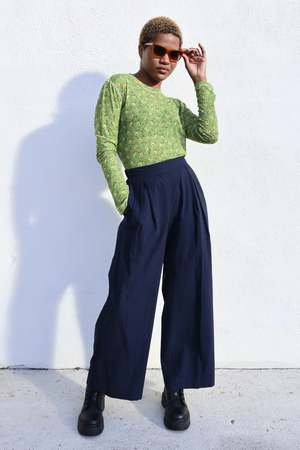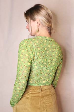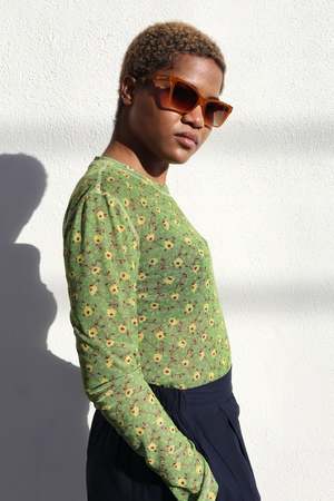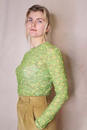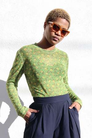 A long sleeve t-shirt in semi-sheer floral printed mesh. Designed with contrast stitching at seams, a relaxed fit, and a high crew neck. The hem is long enough to be worn tucked. Details: - 82% Polyester, 18% Spandex - Dry clean only - Made in New York City, U.S.A About the brand: Launched by owner and designer Karin Bereson in 2005, No.6 began as an under-the-radar shop in the Little Italy / Nolita neighborhood of Manhattan. While consistently creating staples like versatile clog shoes, boots, and printed silk dresses No.6 has expanded to create accessories, denim, swimwear, and more. No.6 takes great pride in its manufacturing practices, domestically producing both its signature clothing line and clogs. No.6 clogs and clog boots are made exclusively by hand.
