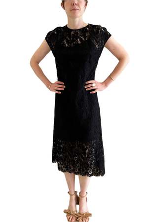 No.6 Erika Dress in Black Lace. This mid-length shift dress features intricate open-work lace, offering a rich textural appeal. Designed with a crew neckline and cap sleeves, it combines a minimal silhouette with elegant details for a refined look. Fabric: 46% Acrylic, 44% Nylon, 10% Wool