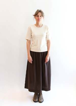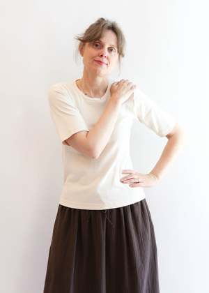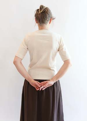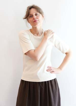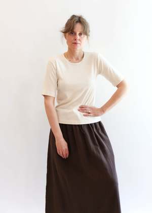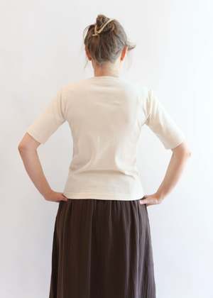 Fitted tee with sleeves that hit just above the elbow, finished with a banded edge collar. Done in our lightweight organic cotton baby rib. This style is entirely made in America - from fiber to finish. 100% Organic Cotton Baby Rib Made in USA