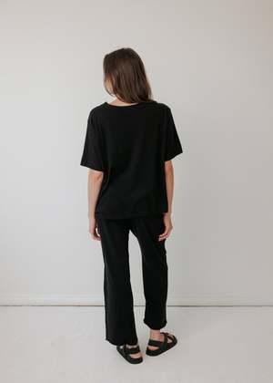 Wol Hide's signature tee shape in their favorite lightweight cotton jersey. Boxy fit with a soft folded collar, wide cuffs, and square-seam armhole detail. This style is entirely made in Americafrom fiber to finish. Material 100% Organic Cotton Lightweight Jersey Color Black Size S: 24" wide at underarm, 23" long from top of shoulder M: 25" wide at underarm, 24" long from top of shoulder L: 26" wide at underarm, 25" long from top of shoulder Origin Made in the USA