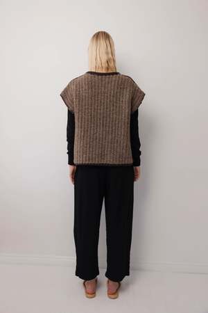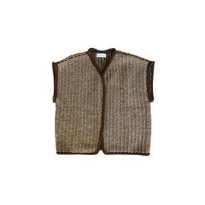 Hand-loomed wide open vest with a curved front. This intricate knit/weave technique has a base yarn with a super bulky, lofty yarn woven into the knit stitches. Dense and warm while staying lofty and soft with the boucle yarn. Note that in production, the front has a more gently sloped curve than in the photos. Made by Wol Hide in Peru. CONTENT & CARE: 28% Alpaca, 28% Fine Highland Wool, 17% Merino Wool, 27% Baby Alpaca MEASUREMENTS (laying flat): S/M - Chest: 22.5" wide at underarm, Length: 26" long from the top of the shoulder M/L - Chest: 24" wide at underarm, Length: 28" long from the top of the shoulder