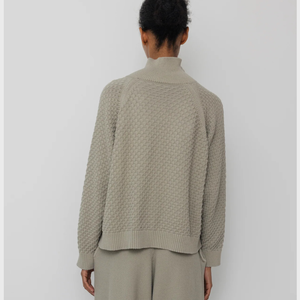 Perfect fit cardigan with an all over highly textured stitch, rib edges and a long rib collar. Perfect to layer year round. This is made with 100% organic, domestic cotton and then knit in NYC. Corozo buttons. The cotton is lightweight with the stitch adding some bulkiness to the style, and it has a soft yet slightly crisp hand feel. Khaki is yarn dyed with low impact dyes. Fully fashioned knits made at factory partners in NYC. The yarn is a crisp summer-weight organic cotton, grown, milled and dyed domestically. 100% organic cotton Made in USA from seed to sweater. Measurements taken while garment is laying flat: - S/M 21.5" long from the top of the shoulder 25.5" wide at underarm - M/L 23" long from the top of the shoulder 26.5" wide at underarm