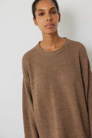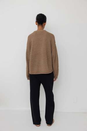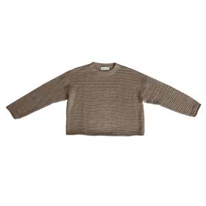 Loose fitting, lightweight pullover sweater with curved hem, curled cuffs, and a gentle U neck. This finer gauge yarn is soft and spongey with a silky hand feel. Made by Wol Hide in Peru CONTENT & CARE: 100% Regenerative Alpaca, Undyed MEASUREMENTS (laying flat) S/M - Chest: 23" wide at underarm, Length: 22" long from the top of the shoulder M/L - Chest: 24.5" wide at underarm, Length: 24" long from the top of the shoulder