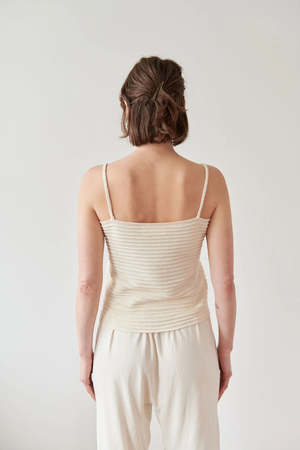The Ripple Cami in Ecru by Wol Hide. A slightly cropped tank with ripple stitch and braided straps. Sizing + Details - Made In Peru - 100% Organic Cotton - Model Wears S S Chest (PTP) 15", Length 13" M Chest (PTP) 16.5", Length 14" L Chest (PTP) 17", Length 14"