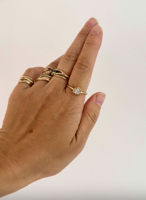 A one of a kind ring by Elaine Ho featuring the palest pink rose quartz stone set in 14K yellow gold. Size 9. Handcrafted in Montreal, QC.