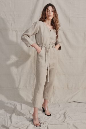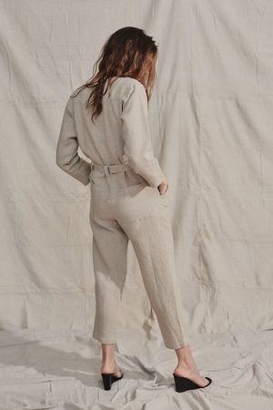Relaxed utility style jumpsuit featuring front patch pockets, wide self belt loops and self belt. Tapered leg Slightly oversized fit 100% Heavy Laundered Linen Made in California Measurements: Size S: Bust: 40", Waist: 38", Hip: 39", Length: 53.5" Inseam: 25.5" Size M: Bust: 41", Waist: 39", Hip: 40", Length: 54.5", Inseam: 26.5 Size L: Bust: 42", Waist: 40", Hip: 41", Length: 55", Inseam: 27" Model is 5'8" wearing size S