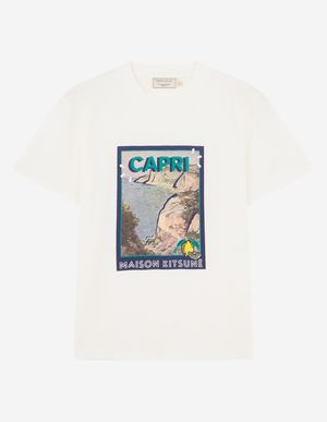 This Maison Kitsune cotton jersey T-shirt is made with short sleeves and a round, ribbed neckline. Done in a straight cut, this T-shirt features a Capri flock print inspired by postcards and posters of yore. Tuck it into a pair of jeans or a high-waisted skirt!
