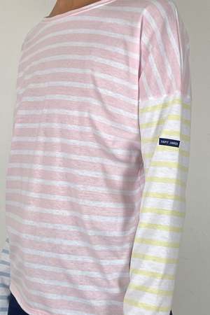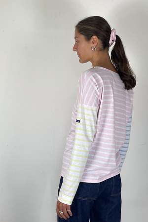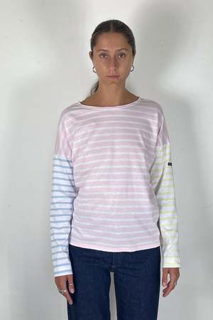 A wardrobe staple from heritage brand 'Saint James' who have been making clothes for sailors since 1889 This special edition Minquiers Modern, is made up of three different colours with a round neck, long sleeves and branded label on one arm. We have styled the piece to be worn oversized 100% lightweight jersey combed cotton Made in the village of Saint James in France Tiffanie wears a size L and is a UK 8