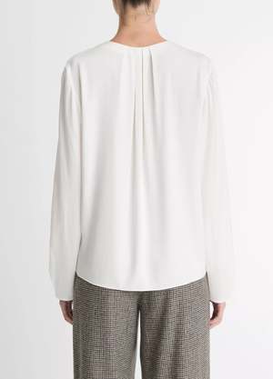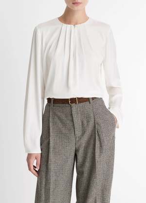 This silk-blend blouse features soft pleating around the collar and cuffs, with a keyhole slit at the front. A refined metal-ball button secures the neckline, adding a subtle detail. Slips on with a keyhole button-and-loop front closure. Length: 24.75 inches.