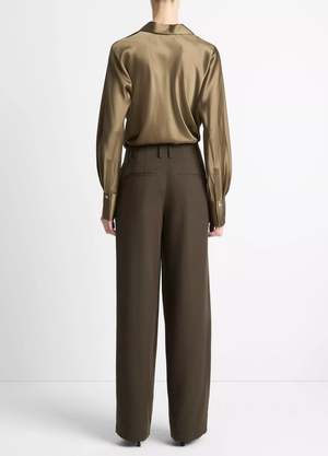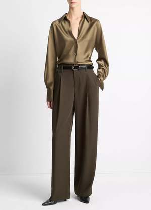 A pleated trouser is an undeniable wardrobe staple for all seasons. This style is distinguished by its perfectly balanced wide leg and refined Hollywood waist. For the moments that call for a full suit, there is a matching oversized blazer. - Zip fly and hook-and-bar closure. - Belt loops. - Adjustable self-belt. - Welt side and back pockets. - 12.25" rise, 32.5" inseam, 21.37" leg opening. - Machine wash cold with like colors, normal cycle, only non-chlorine bleach when needed. Line dry, cool iron if needed or dry clean. - 57% Viscose, 43% Polyester.