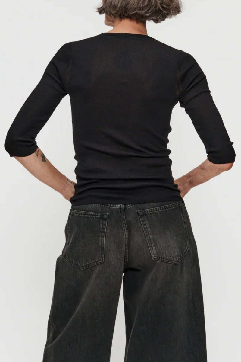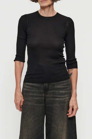 The Heirloom Elbow T has the same attributes as the tank, now with a 3/4-length sleeve. It is a delicate rib sweater made from a Tencel, cotton, and silk blend yarn. Inspired by favorite vintage base layers, it has a shrunken fit through the body with a rib trim at the neckline in a rayon yarn. Body: 55% Tencel, 25% Cotton, 20% Silk Trim: 100% Dull Rayon