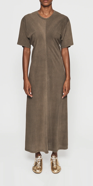 The Sunbleached Draped Dress in Army by 6397 is the perfect combination of comfort and style. Made from 100% cotton, this ankle-length t-shirt dress features a unique center seam and 'sunbleached' color variation for an effortlessly cool look. With a high crewneck, dropped shoulder, and elbow-length sleeves, this dress will drape beautifully on all body types. Details: - Color: Army Green - 100% Cotton - Dropped shoulder, elbow-length full sleeve - Tapering at waist - Vendor Code: ND317 - Fits true to size - Model is 5ft 5in and is wearing a size XS
