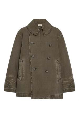 A wonderful washed-down canvas jacket, military inspired, with an oversized silhouette and intentional distressing and whiskering throughout for a lived-in look. Double-breasted closure with anchor details on the buttons. Wide collar and broad lapel. Large hook-and-eye closure at the neck. Swing-style silhouette, falling right below the high hip on most. Large side slit pockets. 100% Cotton Canvas.