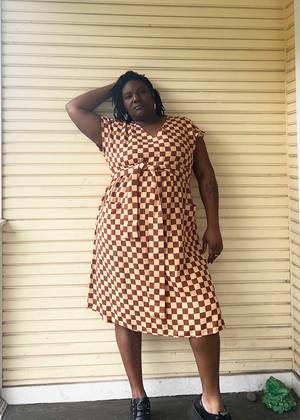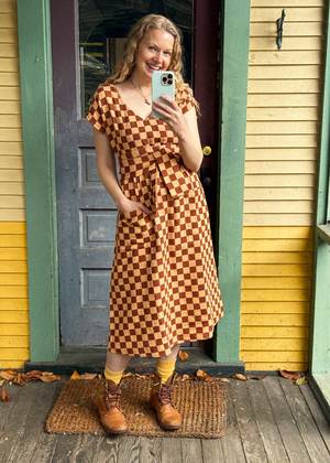 A sleeveless empire dress with a v-neck front, patch pockets, and a removable fabric belt. Made in the Rhyme textile, a lofty supersoft doublecloth featuring a pale peach and cinnamon brown woven checker pattern that feels like a knit. Made in India from 100% organic cotton. Hand wash cold or dry clean, dry flat. This textile is made with 100% GOTS (Global Organic Textile Standard) non-GMO organic cotton without the use of harmful chemicals and synthetic fertilizers. This garment is sewn in a Fair Trade Certified factory. Jenna is 5'6" and wears the Antoine Dress in the Rhyme textile, size S. Garment measurements (taken flat): XXS: 44 long, 18 chest, 17 waist XS: 45 long, 19 chest, 17 waist S: 46 long, 20 chest, 18 waist M: 46 long, 21 chest, 19 waist L: 47 long, 22 chest, 21 waist XL: 47 long, 23 2/4 chest, 22 waist 1X: 47 long, 25 chest, 23 waist 2X: 48 long, 27 chest, 25 waist 3X: 48 long, 29 chest, 27 waist 4X: 48 long, 31 chest, 29 waist.